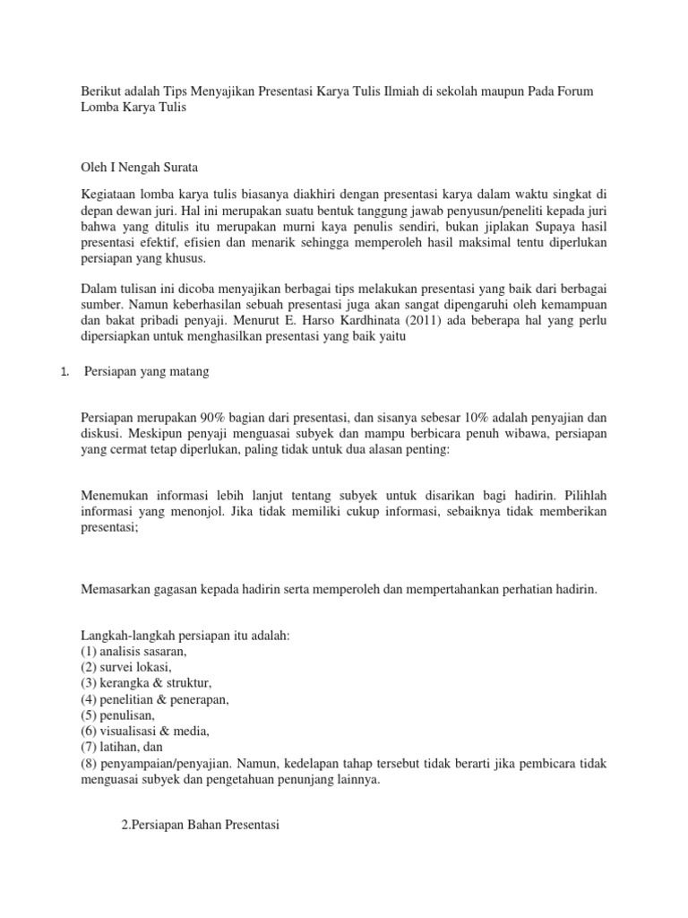 Namun ada langkah-langkah khusus yang perlu dilakukan untuk membuat sebuah tulisan menjadi unik dan menarik untuk dibaca oleh pembaca. Kegiataan lomba karya tulis biasanya diakhiri dengan presentasi karya dalam waktu singkat di depan dewan juri. Berikut adalah Tips Menyajikan Presentasi.
