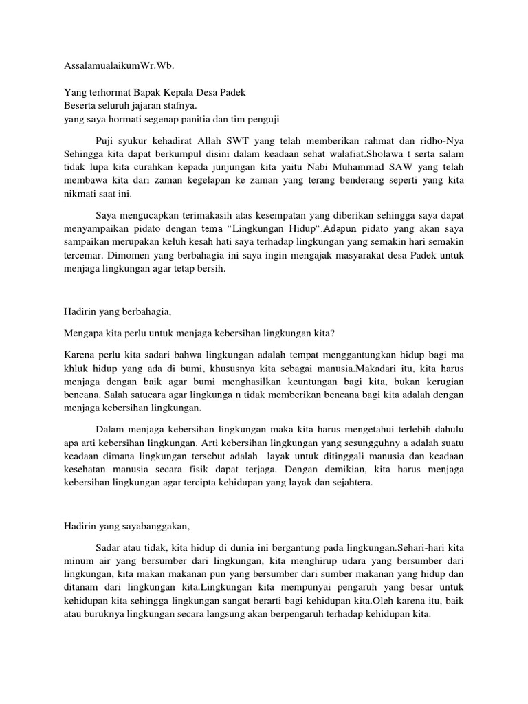 Yang saya hormati Tokoh-tokoh masyarakat Desa. Masroziq - Contoh Pidato Kebersihan Lingkungan Masyarakat Lingkungan sehat adalah lingkungan yang bebas dari segala macam penyakit polusi dan hal-hal yang tidak enak. Kepala Desa adalah Kepala Desa Nita.