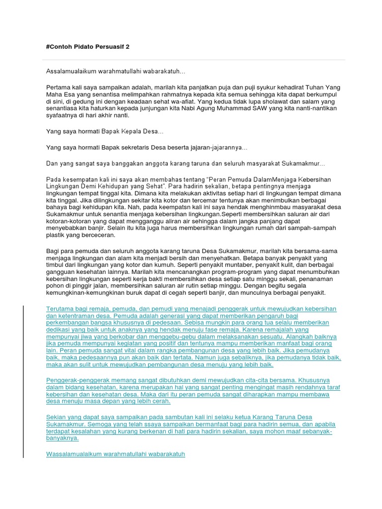 Contoh pidato persuasif tentang kebersihan lingkungan dengan dihadiri kepala desa dan warga RT si pidato sebagai ketua RT - 32212697. Pidato singkat tentang kebersihan pada artikel sebelumnya kita telah membahas beberapa. Contoh teks pidato sambutan kepala desa dibawah ini bisa dijadikan latihan sebelum melakukan pidato.