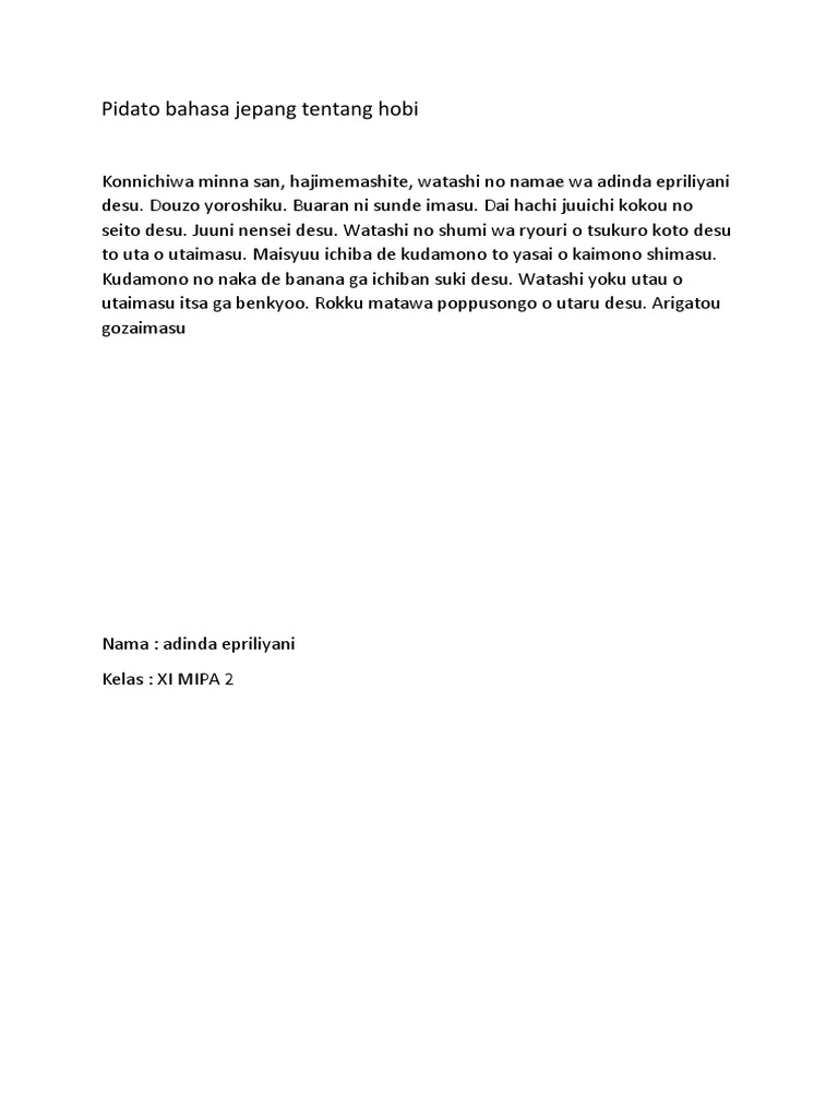 Pidato jepang tentang hobidocx pidato jepang tentang hobidocx Menyatakan Hobi dalam bahasa Jepang Belajar Bahasa Jepang Online. Contoh Paragraf Bahasa Inggris Tentang Hobi 3. Akan tetapi memiliki sebuah hobi dapat.